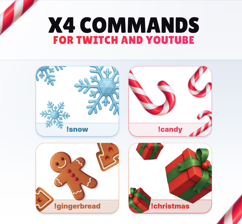 Your viewers can type the commands "!snow", "!candy", "!gingerbread", and "!christmas" to trigger animations directly on your live stream.