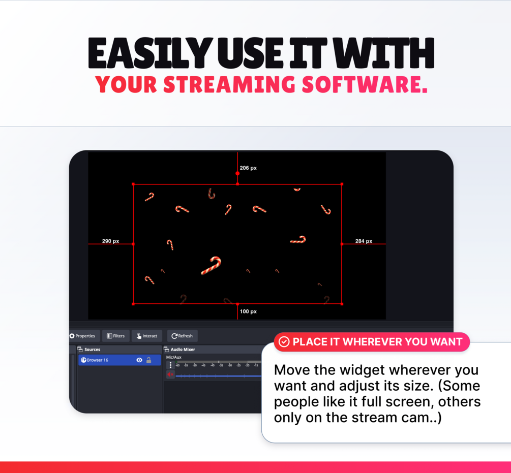 Your viewers can type the commands "!snow", "!candy", "!gingerbread", and "!christmas" to trigger animations directly on your live stream.