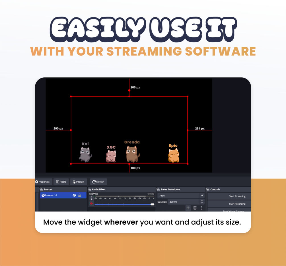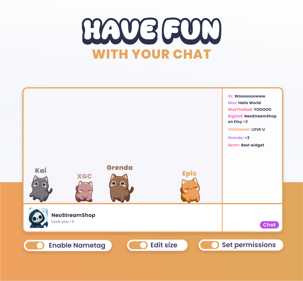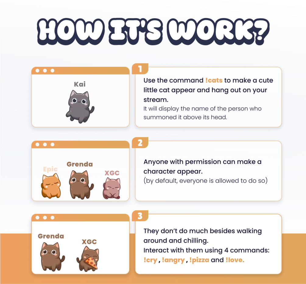 🎉 This streaming widget allows each of your viewers to spawn a small cat live on the stream. Each character has a unique color and size. It will move around on its own and respond to 4 commands.