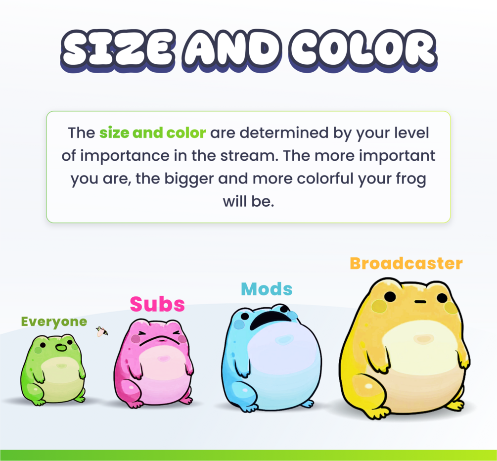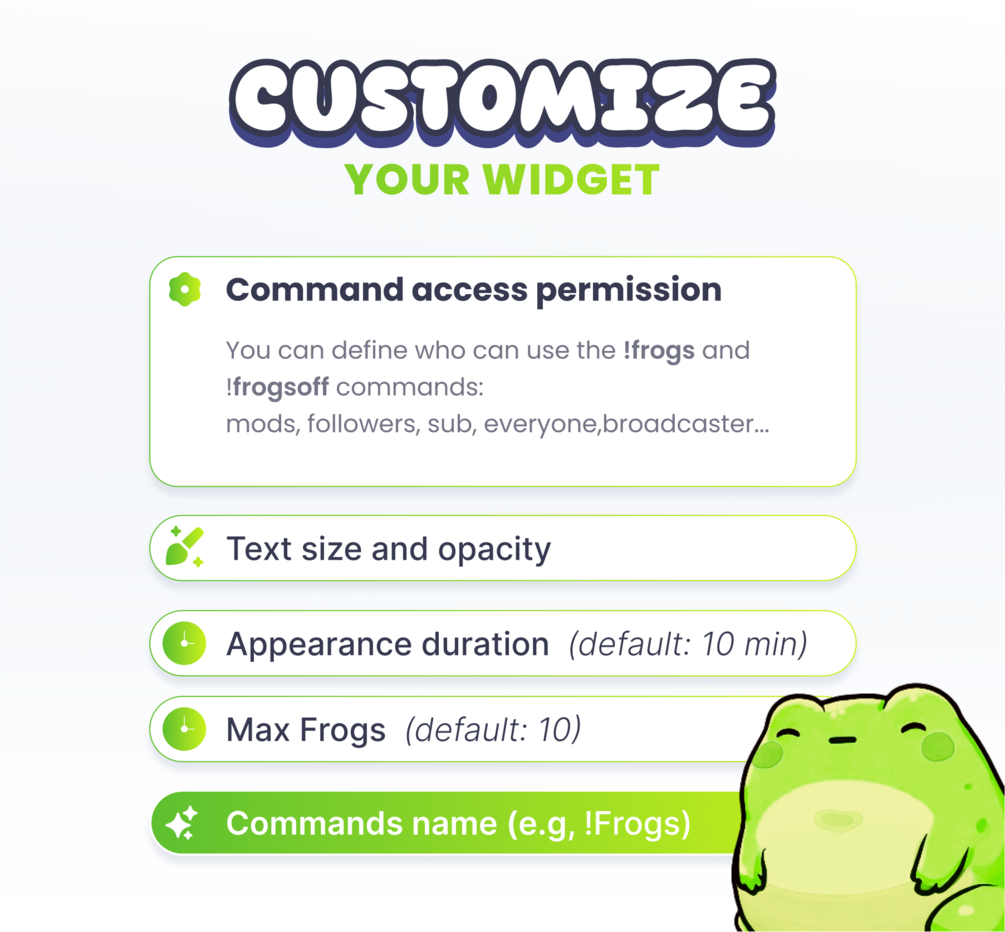 🎉 This streaming widget allows each of your viewers to spawn a small frog live on the stream. Each character has a unique color and size. It will move around on its own and respond to 4 commands.