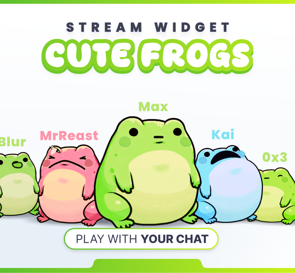 🎉 This streaming widget allows each of your viewers to spawn a small frog live on the stream. Each character has a unique color and size. It will move around on its own and respond to 4 commands.