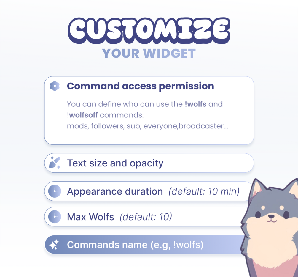 🎉 This streaming widget allows each of your viewers to spawn a wolf live on the stream. Each character has a unique color and size. It will move around on its own and respond to 4 commands.