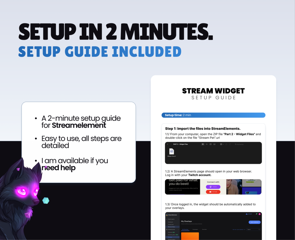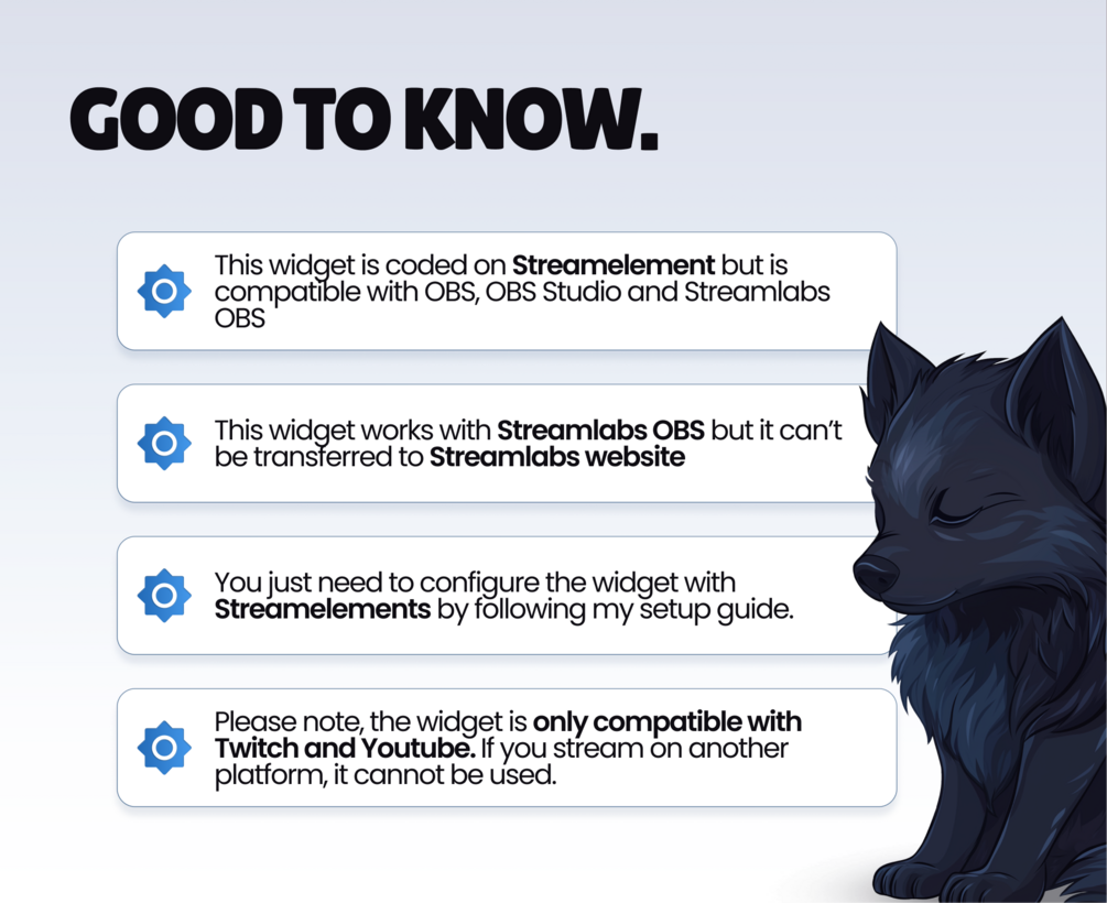 This mascot works under Streamelements and can be transferred to your OBS/Streamlabs scene. It doesn't require any coding skill to be set up, a setup guide is included in the product :)