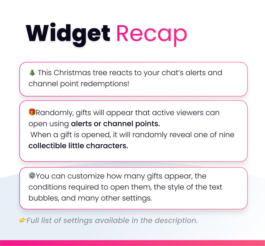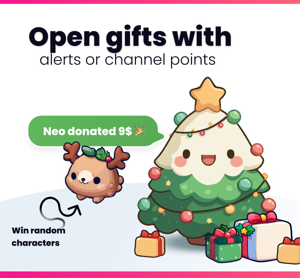 🎁If you want to add gifts manually, you can use the !addgift chat command (streamer and mod only). This will add a gift under the tree that your viewers can open.