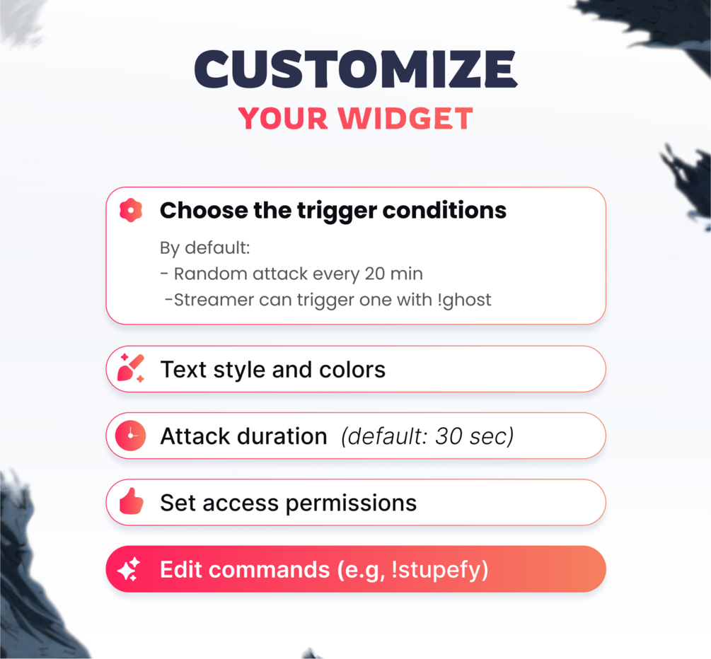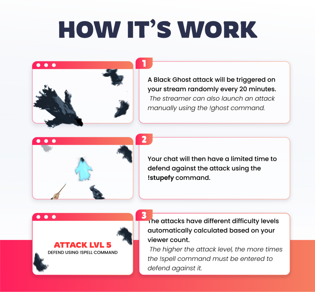 🎉 This Magic Stream widget will randomly trigger Black Ghost attacks on your livestream. Your chat will have to defend you by using the command !stupefy.